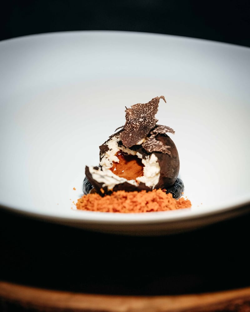 Stepping inside, guests are met with a decidedly contemporary setting, with the colour black dominating the decor. In true homage to Pierre Soulages, the restaurant is beautifully adorned with various photographs and an unexpected ceiling sculpture of a man falling. The atmosphere is both modern and sophisticated, with an intriguing twist, making it a feast not just for the palate, but also for the eyes. The restaurant's attention to detail extends to the ambiance of the space, where every table is perfectly set to elevate the dining experience.