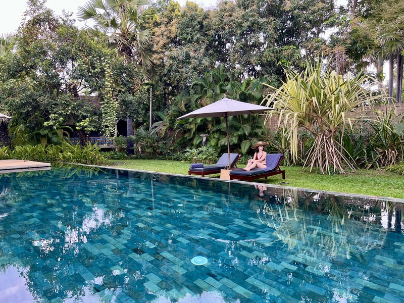 The landscaped environment plays a full part in the immersive experience. Nestled in a lush garden where sugar palms, banana trees, areca palms, and rice fields coexist, Sala Lodges gives the impression of being immersed in an idealized Cambodian countryside. Herbs and spices are grown there for the restaurant, while local fauna also finds refuge. The 20-meter infinity pool, lined with deckchairs, fits perfectly into the natural setting and becomes a haven of freshness after a day exploring the temples of Angkor.