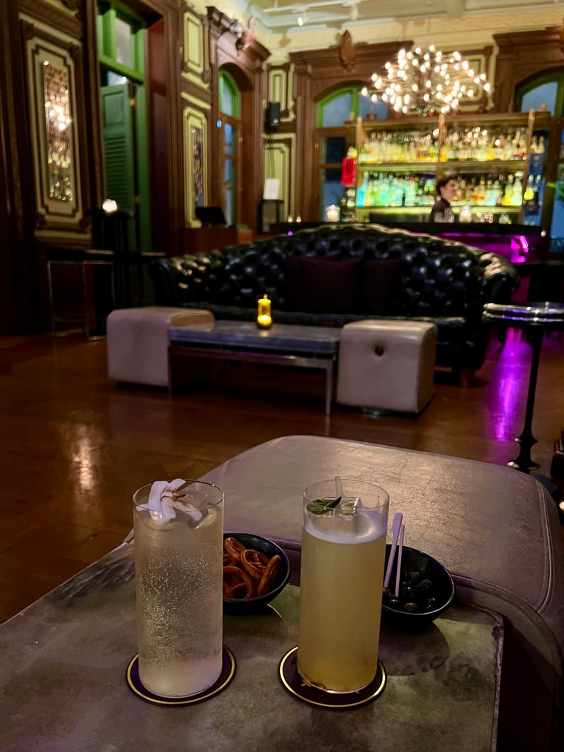Located on the ground floor of this iconic house, Bar Sathorn offers a cocktail experience as refined as it is inspired. Ranked No. 48 by Asia's 50 Best Bars 2025, the bar captivates with its hushed, sophisticated atmosphere, punctuated by electro-swing sounds and a décor blending plush leather armchairs, antique parquet floors and dimmed lighting. Its signature menu, conceived as a tribute to the great periods of the house's history, unfolds in bold creations, with or without alcohol, accompanied by savory bites. To open the evening, we opted for two mocktails with surprising combinations: the 00 Knees, with subtle notes of lime, chamomile, Thai wild honey and lemongrass, and the 00 Pickled Colada, a surprising blend of marinated pineapple, coconut and non-alcoholic whiskey. As an accompaniment, the Heritage Sliders — a trio of mini-burgers with marinated chicken, Phuket pineapple and peanut sauce — perfectly complemented this refined appetizer, true to the creative and elegant spirit of Bar Sathorn.