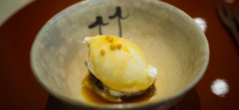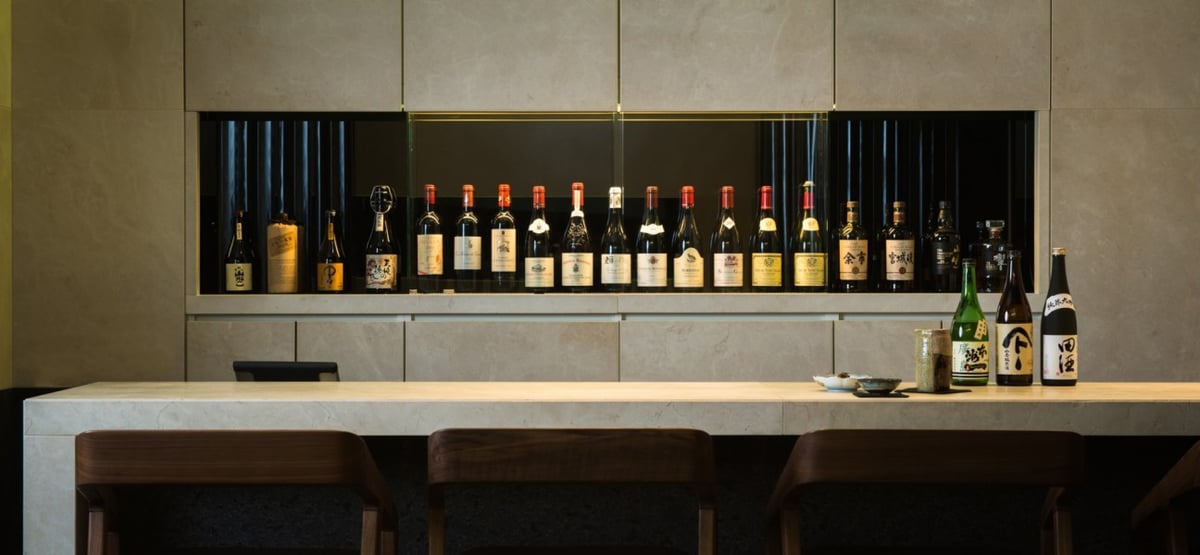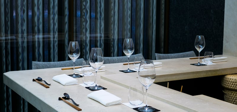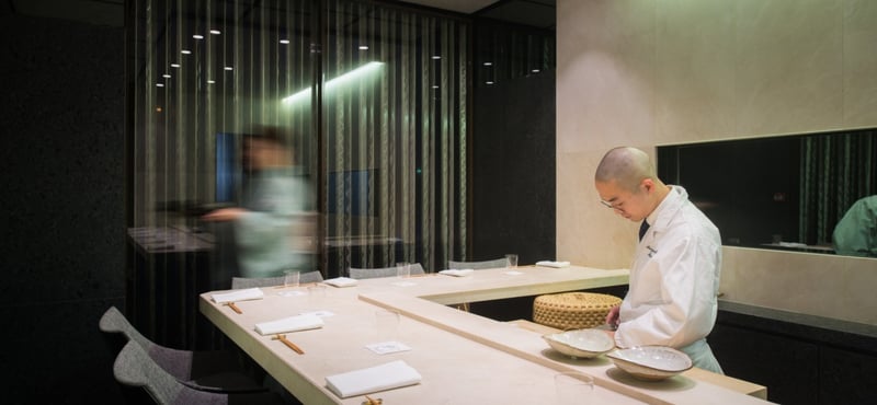 The restaurant's zen and minimalist style fosters a calm and tranquil atmosphere. With only eight seats, every detail in this bijou setting has been carefully considered. The elegant counter, plush fabric chairs, delicate glassware, and crisp white cotton napkins create a serene ambience that complements the fine dining experience. Marble features prominently in the décor, even extending to the lavatory facilities, which are, of course, Japanese in design.