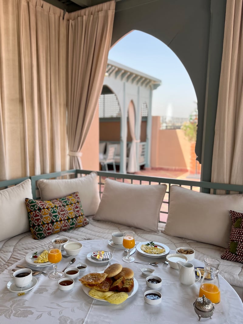 At Riad Kniza, gastronomy goes beyond simple dining to become a true sensory experience, where tradition, refinement, and Moroccan hospitality meet. In the morning, breakfast is served generously, enjoyed on the sunlit terrace or in one of the shaded patios. Freshly baked homemade pastries, light crêpes, eggs made to order, and seasonal fresh fruits create a colorful feast that awakens the senses and gently starts the day.