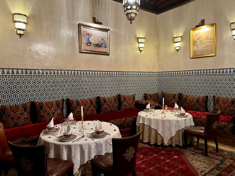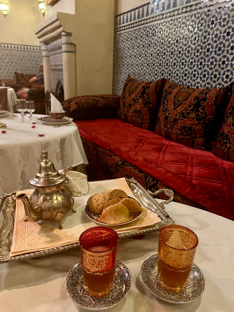 But it is at dinner that Riad Kniza's culinary art reveals its full magic. Renowned for its authentic family recipes passed down from generation to generation, the house invites guests on a true culinary journey. Seated in one of the elegant dining rooms, we savored a multi-course menu, designed as a refined celebration of Moroccan traditions. The already intimate and warm atmosphere was enhanced by the mesmerizing music of Gnawa musicians, whose songs and rhythms accompanied each dish, adding a poetic and timeless dimension to this unique moment.