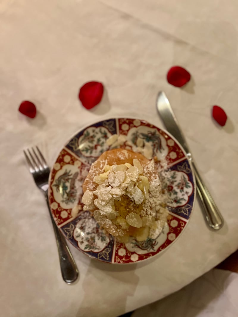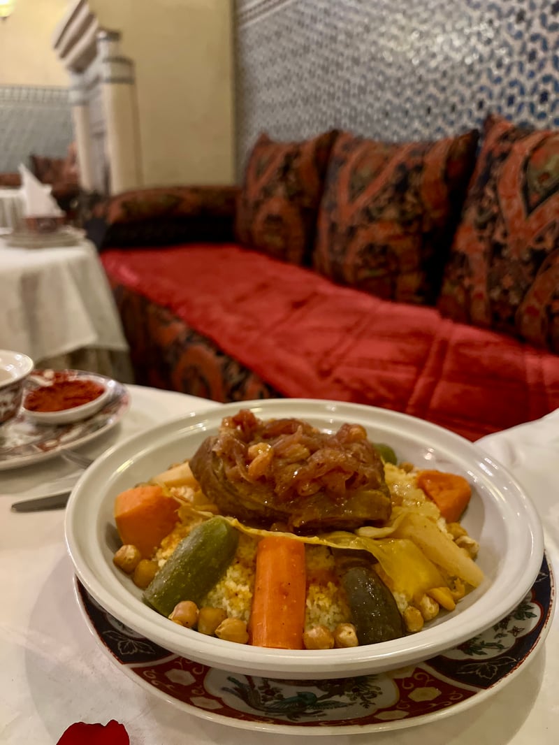 The meal began with a refined assortment of Moroccan salads with contrasting flavors, followed by crispy briouates subtly filled with meat and seafood. For the main course, two great classics of Moroccan gastronomy were served: a chicken tagine with preserved lemon and olives, tender and fragrant, and a royal couscous with lamb and vegetables, generous and delicious. To crown this feast, the Johara—a delicate almond cream pastilla, caramelized to perfection—was followed by Moroccan pastries and a glass of mint tea, a true symbol of hospitality and conviviality.