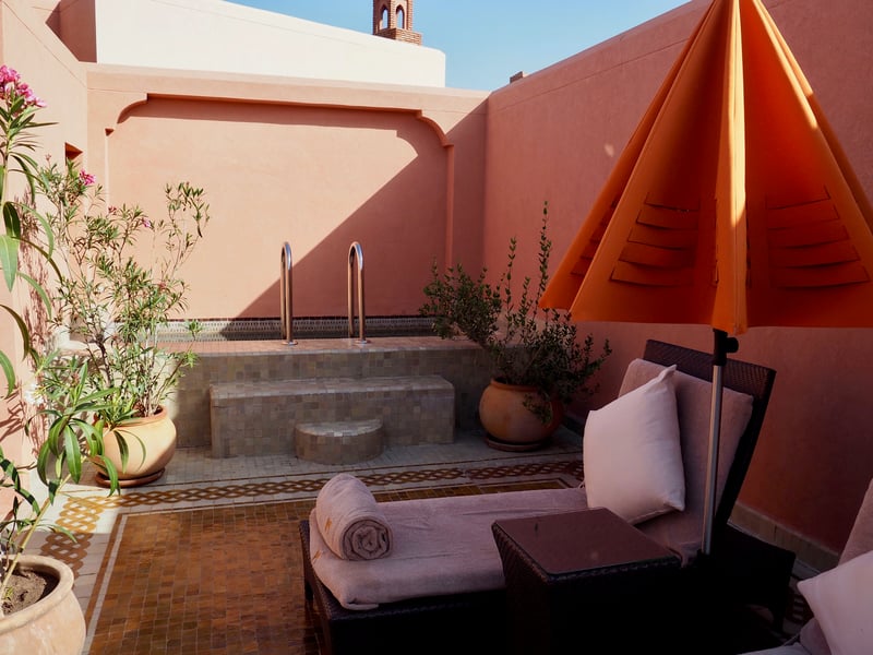Each riad features three floors with an interior courtyard, a living room, a dining room (for the larger riads), between one and three bedrooms with a marble bathroom, and a rooftop with a private terrace, small pool, and a few deckchairs. We chose the Superior Riad, the smallest of the houses with just one bedroom—yet with 140 m² for just the two of us, we certainly had plenty of space!