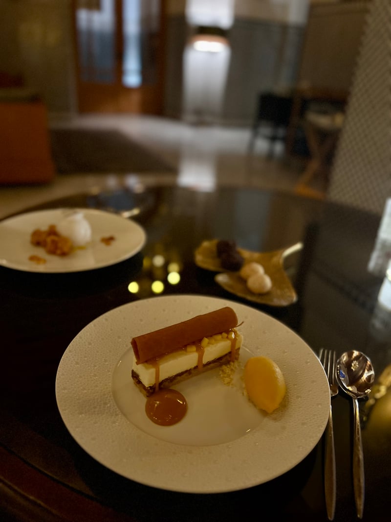To end this dinner beautifully, two exotic desserts closed the meal with lightness and inventiveness. The first, titled Pineapple ~ Coconut, combined pieces of caramelized pineapple with pink pepper with an airy coconut sorbet. It was a dessert of pure freshness, where textures and aromas danced with elegance. The second, Mango ~ Malai, was a refined interpretation of cheesecake: a crunchy base, a creamy malai center, saffron caramel, pink peppercorns, and mango sorbet. Rich in sensations yet perfectly balanced, it concluded the culinary experience on a silky, fruity, and characterful note.