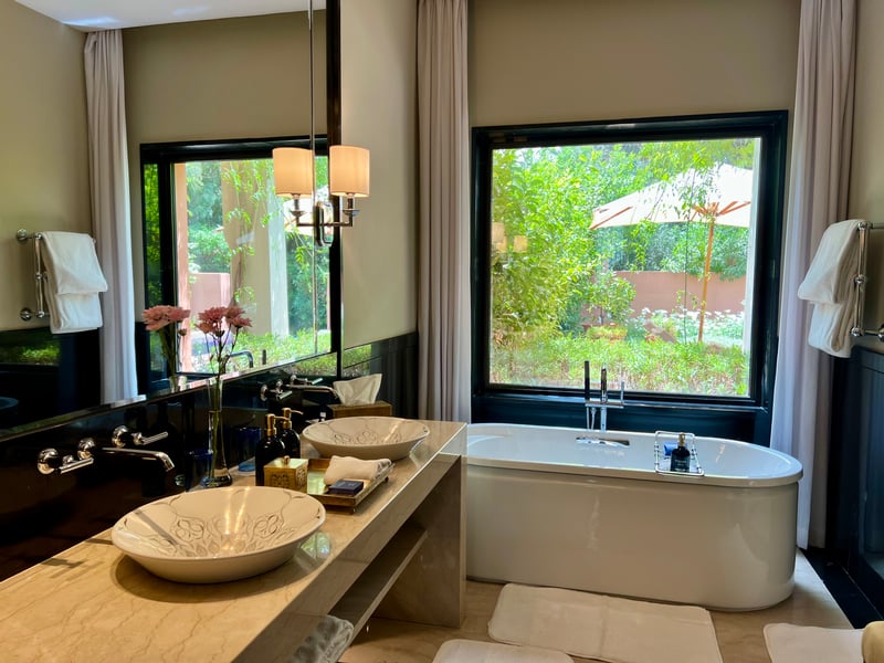 But it is the villas, scattered throughout the gardens, that give this 5-star property its unique atmosphere, both grand and intimate. Organized in small groups at the heart of abundant nature, they evoke the spirit of private riads, with their patios, pools, and enclosed gardens. Among them, the Deluxe Villa where we stayed was a true enchanted retreat. Behind a carved wooden door, a 125 m² garden unfolds around a 9-meter heated pool, bordered by shrubs and flowers. Inside, a 72 m² space designed as a cocoon of discreet luxury: an ultra-comfortable king-size bed, silk rugs, traditional zelliges, carved wall panels, and a sunlit bathroom with a freestanding bathtub and direct access to the outdoors. Every detail is designed for rest, serenity, and a form of joyful solitude.