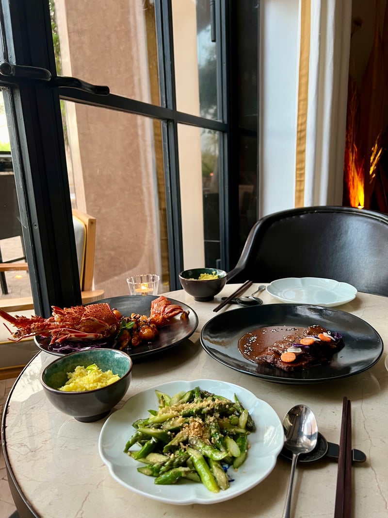 For the main courses, we delighted in Black Angus beef ribs, garlic sautéed asparagus, an absolutely succulent lobster with preserved lemon, and egg and spring onion fried rice. Masterful dishes, flavorful and transporting us to Asia. The dessert, a yuzu and calamansi mousse, enhanced with white chocolate, was a delightful discovery.