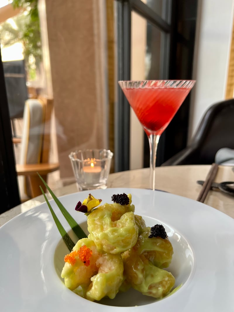 We continued with a crispy beef salad, garnished with grapefruit, pine nuts, and shallots, an ultra-flavorful and refreshing combination. Next, the crispy tiger prawns with wasabi awakened our taste buds with their intensity.