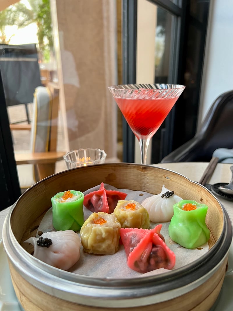 As we enjoyed our exquisite cocktails, a Mojito Oritsu (a subtle blend of rum, yuzu, shiso, and champagne, perfectly Japanese-inspired) and a Red Cosmo (vodka, flower syrup, orange liqueur, grapes, and lemon, inspired by Morocco), we explored the extensive menu, which proved to be most tempting. We opted for the Ling Ling Escape menu, an ideal selection to discover the restaurant's signature dishes. It's impossible to start a Cantonese meal without the essential dim sums, which I particularly enjoy. The supreme platter of eight pieces offered an assortment of refined flavors: a steamed squid Siu Mai dim sum with goji berries, another with scallops and prawns, another with tiger prawns and asparagus, and a final vegetarian one with zucchini and mushrooms.