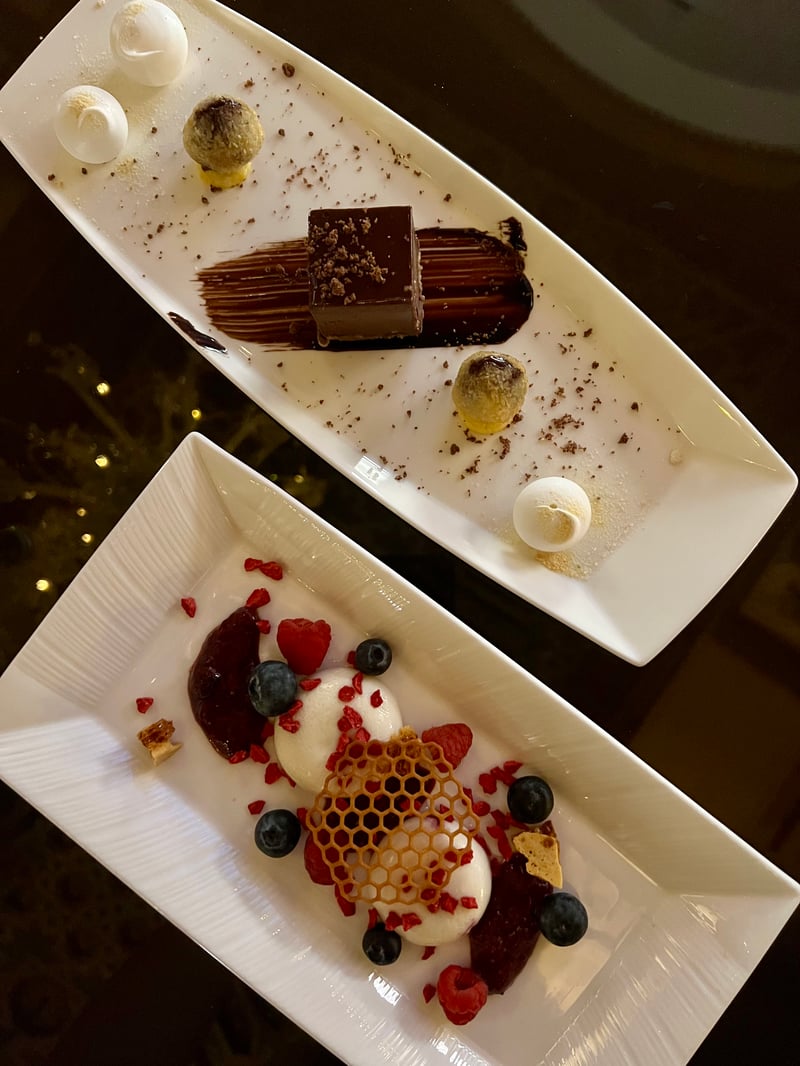 To conclude on a sweet note, we enjoyed a duo of desserts: the indulgent combination of chocolate and orange, as well as Bhappa Doi, a light and fresh dessert composed of steamed yogurt, a crispy honey tuile, chutney, and berries, providing an elegant finish to this memorable meal.