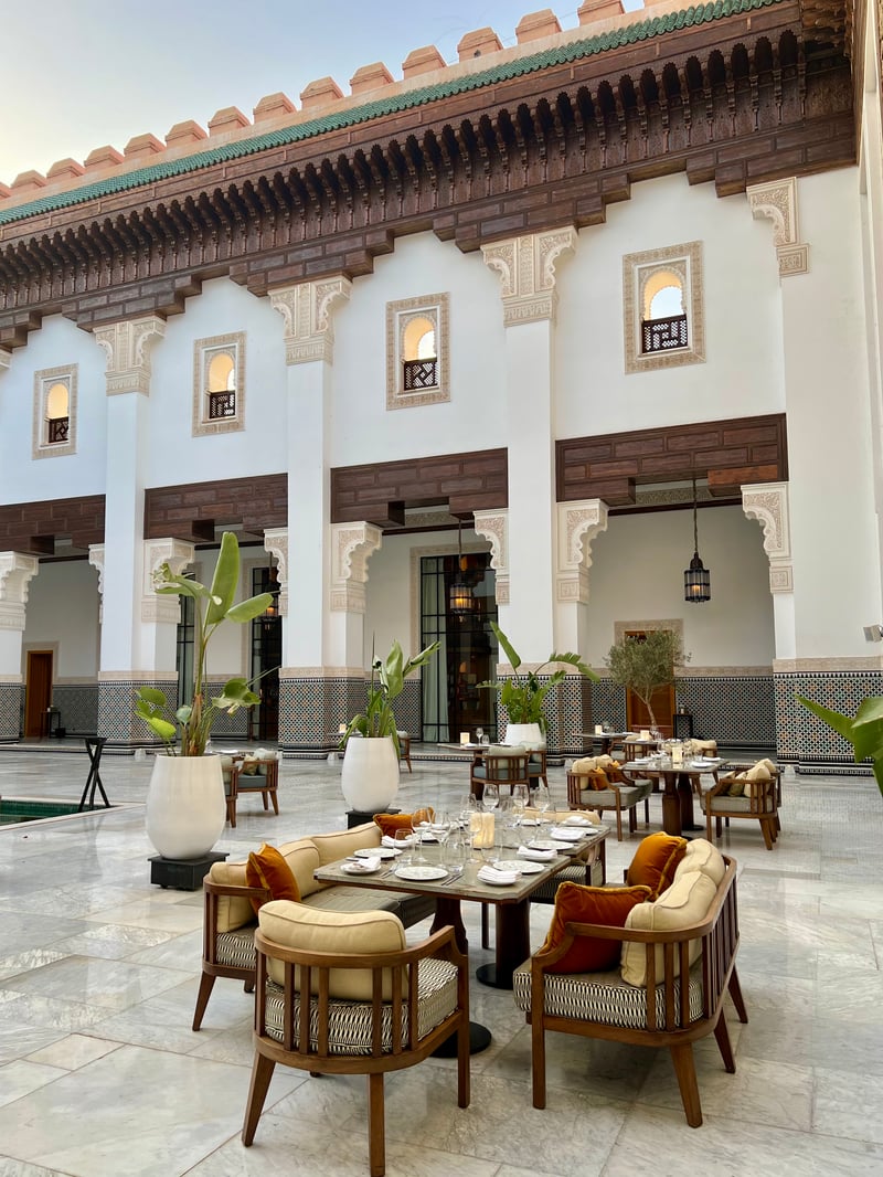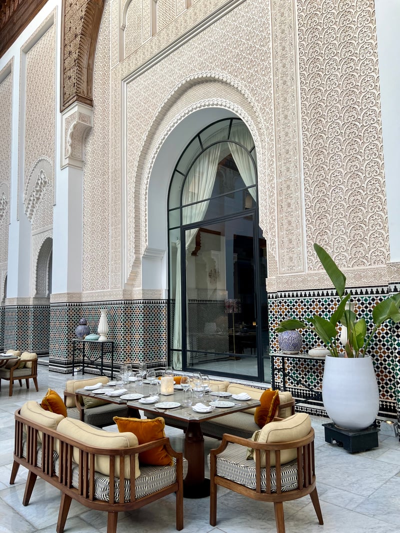 Outside, the majestic patio, inspired by the Ben Youssef Madrasa, offers an idyllic setting for outdoor dining, where tables arranged by the pool allow guests to fully appreciate the architectural beauty of the place. The refined tableware by Raynaud, accompanied by typically Indian metal containers, completes this unique visual and sensory experience.