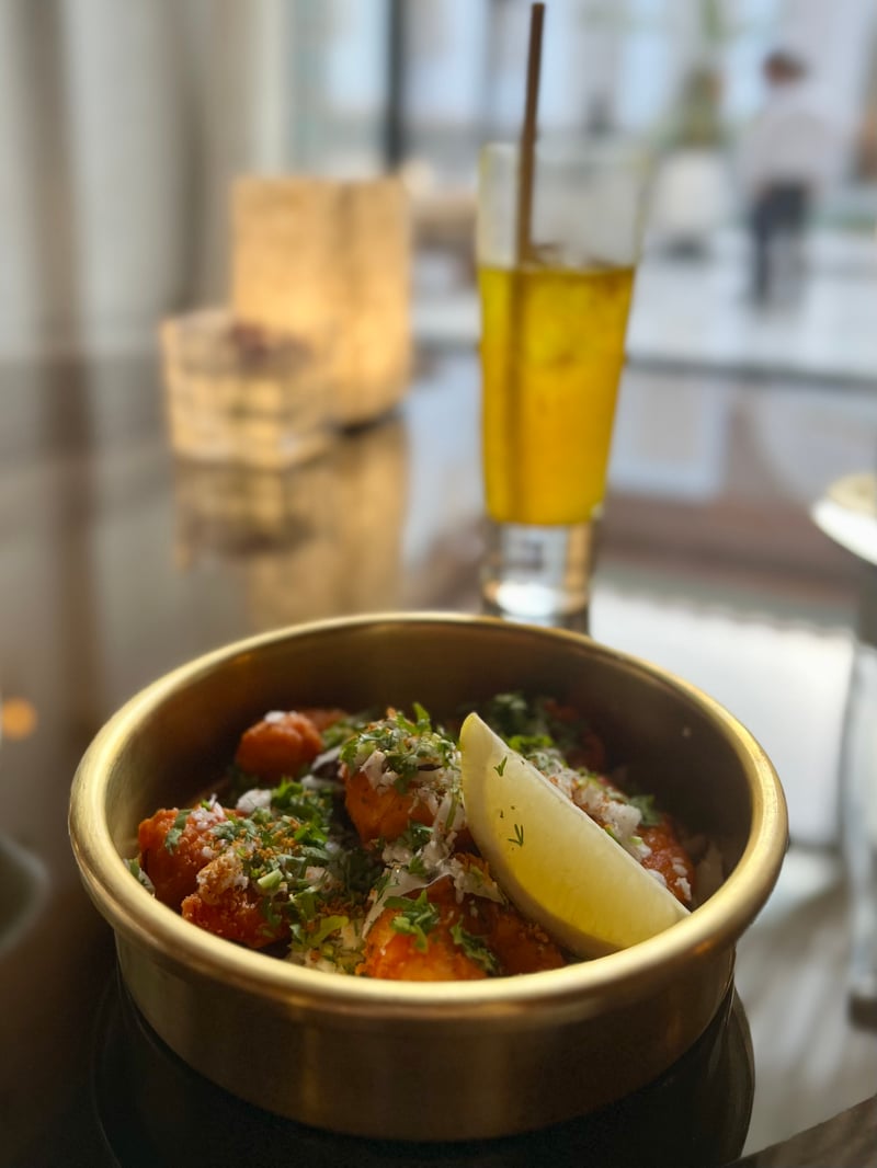 To fully appreciate the chef's creations, we opted for the Signature – Expedition menu. The festivities began with Masala prawns, coconut, sesame, and peanuts, a delicious dish that transported our taste buds directly to India. Next, we savored the Mooli salmon, delicately flavored with tandoori tikka, accompanied by raita and pickle, followed by ultra-comforting brioche rolls filled with intensely flavored shredded goat.