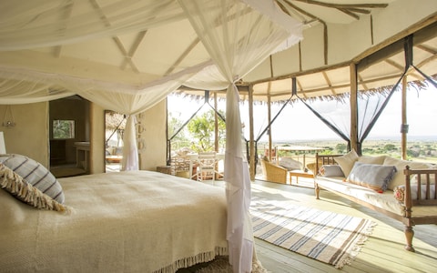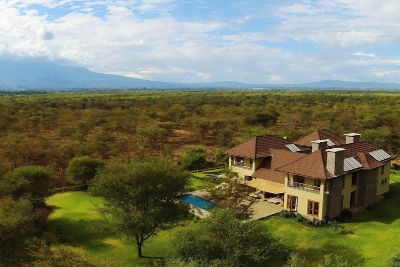 Six bedrooms with private balconies frame Mount Kilimanjaro and Mount Meru across Tanzania's northern plains. Guests board vintage Land Rovers for traditional safaris tracking elephant, lion, leopard, and zebra through the bush, or join Bedouin-style expeditions that follow migrating herds. Between game drives, the fairways of Kiligolf offer an unusual hazard: impala and gazelle grazing alongside players.
