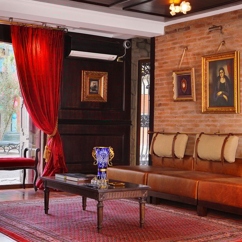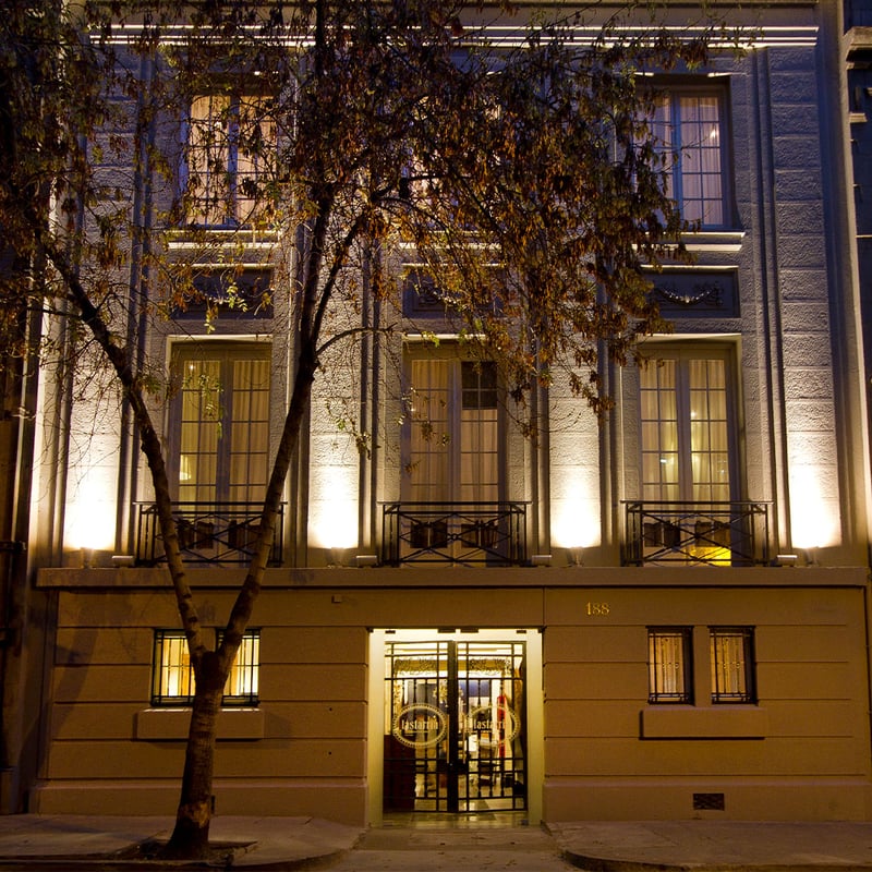 A 1927 mansion in bohemian Lastarria preserves its grand marble staircases, original parquet, and chandeliers while adding bold contemporary art and sleek furnishings. The fourteen rooms surround a stone staircase that descends into a verdant courtyard garden with a small pool—candlelit at night, it becomes Santiago's most atmospheric spot for Chilean shrimp sautéed in garlic and local Sauvignon Blanc at the Deli Lounge.
