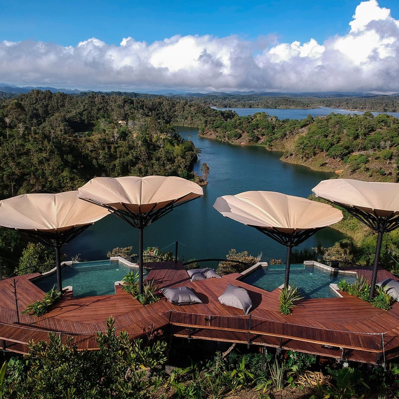 Ten dome-shaped cabins rise from native forest above the turquoise Peñol-Guatapé Reservoir, their transparent walls framing the Colombian highlands. Each sustainably built 'mushroom' offers king canopy beds, open-air showers, and private decks—several featuring hot tubs or plunge pools. Infinity pools cascade toward the lake, heated after dark for night-sky immersion. This adults-only retreat sits two hours from Medellín, near the colorful village of Guatapé.