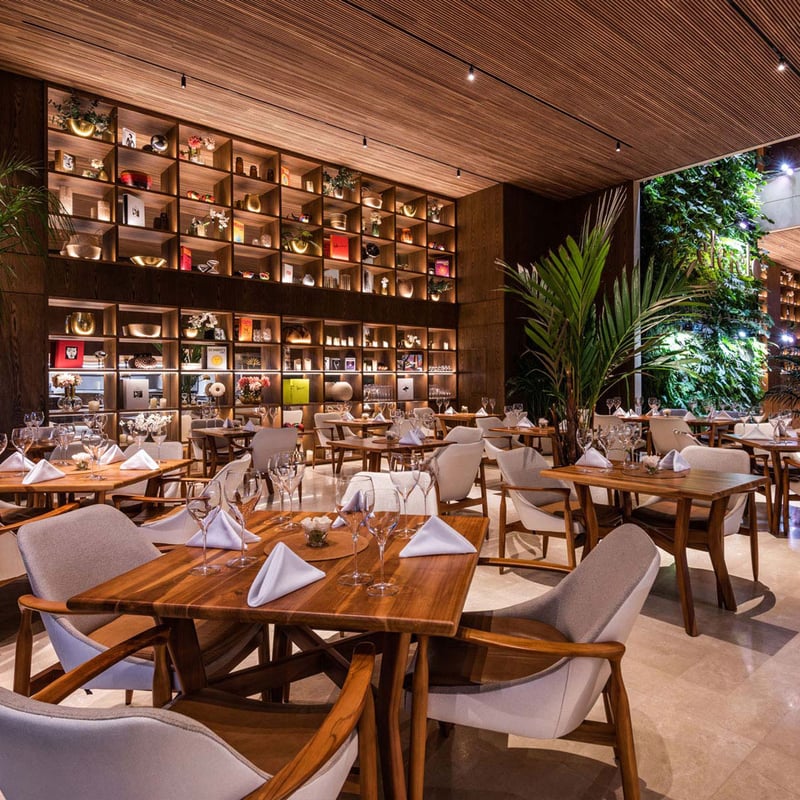 Michelin-starred chef Juan Manuel Barrientos brought his culinary vision to El Poblado with this striking 28-suite property, its façade wrapped in articulated metal screens that filter Colombian light into a soaring atrium garden. Upstairs, hardwood paneling meets travertine bathrooms in spaces of restrained luxury. The real draw remains the restaurant's 17-course sensorial tasting menu—a destination for gastronomes exploring Medellín's transformation.