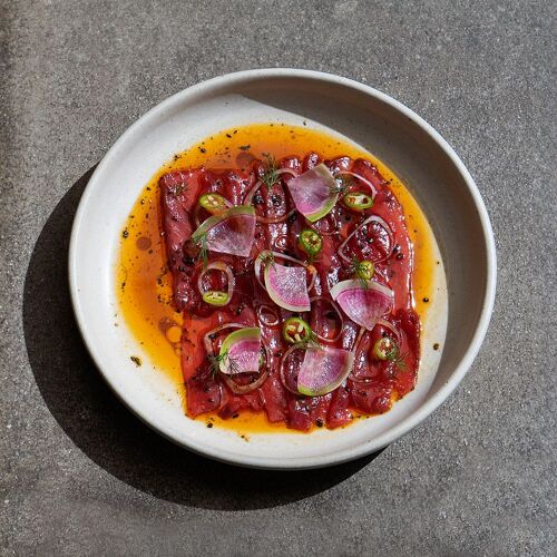 A sleek concrete-floored dining room with white-tiled open kitchen sets the stage for the Hussong family's seafood-focused venture. The concise menu earns its Bib Gourmand through dishes like the signature tuna al pastor taco—spice-rubbed fish with satisfying crumble, pickled onion slivers, and avocado purée. Fresh pasta with shrimp and octopus pizza follow, while mezcal sours flow from the bar.