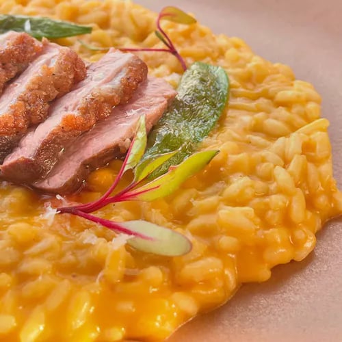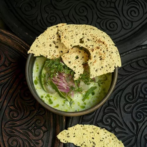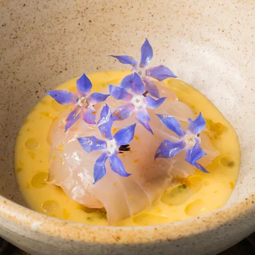 Chefs Norma Listman and Saqib Keval have built a one-Michelin-star kitchen on audacious cultural crossings—African, Indian, and Mexican traditions colliding in dishes like suadero-stuffed samosas and Veracruz prawns finished with vanilla butter. Their chilpachole arrives reimagined with softshell crab and tamal colado, while dessert closes the arc: fudgy chocolate tamal brightened by orange supremes and rose-pistachio dust.