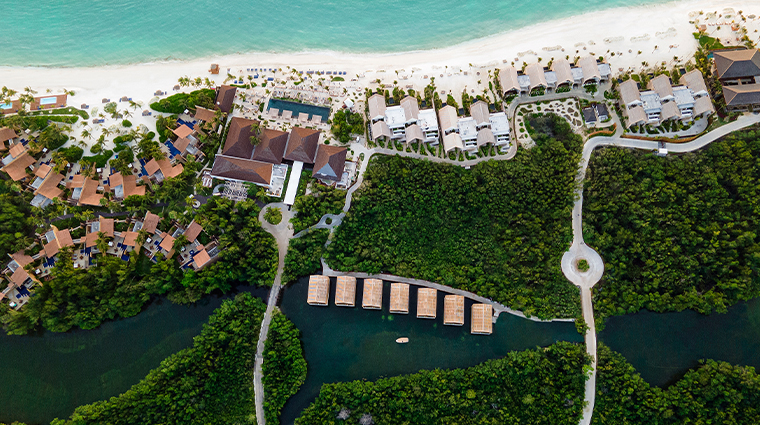 Elevated walkways thread through dense mangroves to reach this 75-room retreat where regional stone towers rise above the canopy, every suite oriented toward calm waters protected by Cozumel Island. An in-house shaman sets the contemplative tone with daily ceremonies, while SANA spa channels Mayan healing traditions alongside a sound healing shala. Three restaurants span the culinary range—Itzam's comal-centered Mexican fare, Che Che's Japanese-Mexican seafood, and beachside ceviches at El Changarro.