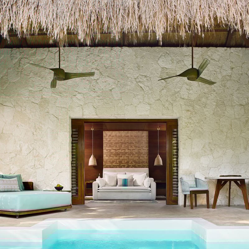 Seventy freestanding villas built from traditional stone and wood line 200 yards of private Caribbean beach at Punta Maroma, each with its own plunge pool and terrace dissolving the boundary between interior comfort and tropical air. Mexico City chef Jorge Vallejo brings coastal Yucatán flavors—ceviche, clams—to the table, while the spa draws on Maya healing traditions with hammam, sauna, and jacuzzi.