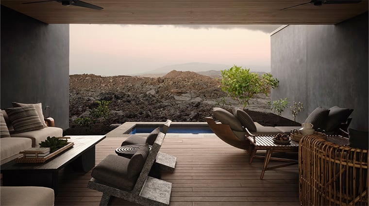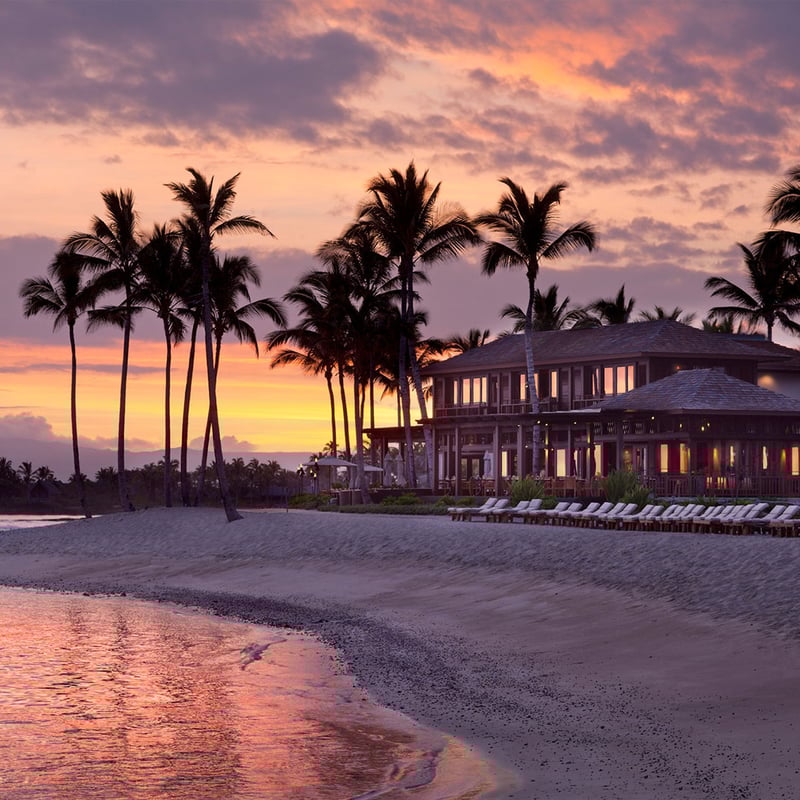 Low-slung bungalows emerge from black lava rock along the Kona-Kohala coast, every room framing the Pacific. Guests drift between a saltwater pool teeming with eagle rays and tropical fish, the serene 28,000-square-foot spa, and Jack Nicklaus's championship course. Evening brings ULU's oceanfront tables and NOIO's intimate omakase counter—two of Hawaii's most romantic dining addresses. Ideal for families and couples seeking polished Hawaiian seclusion.