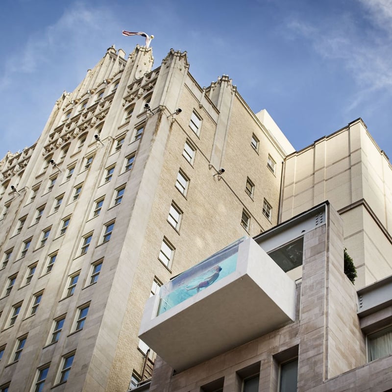 A 1927 Gothic bank building turned art-filled boutique hotel, The Joule anchors downtown Dallas with Adam Tihany's bold contemporary design layered over preserved marble floors and original elevators. The cantilevered rooftop pool juts eight feet beyond the façade, its Plexiglas end wall hovering above Main Street. Below ground, Midnight Rambler serves inventive cocktails from bartender Gabe Sanchez, while a two-story spa draws on crystals and atmospheric light.