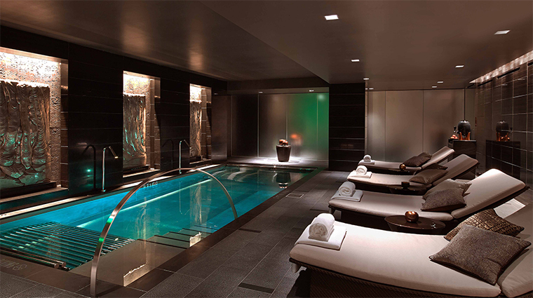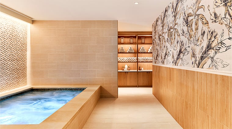 Descending into this 8,000-square-foot subterranean retreat designed by Adam D. Tihany, guests encounter dark blue-gray tiles wrapping two floors of thermal wellness. The European Heat Experience cycles through dry sauna, eucalyptus steam room, and ice fountain, while a heated vitality pool modeled on geothermal springs soothes tired muscles. Signature treatments include the Fire & Ice Stone CBD Massage with jade crystals and volcanic stones, and a Himalayan salt ritual concluding with hot stone therapy.