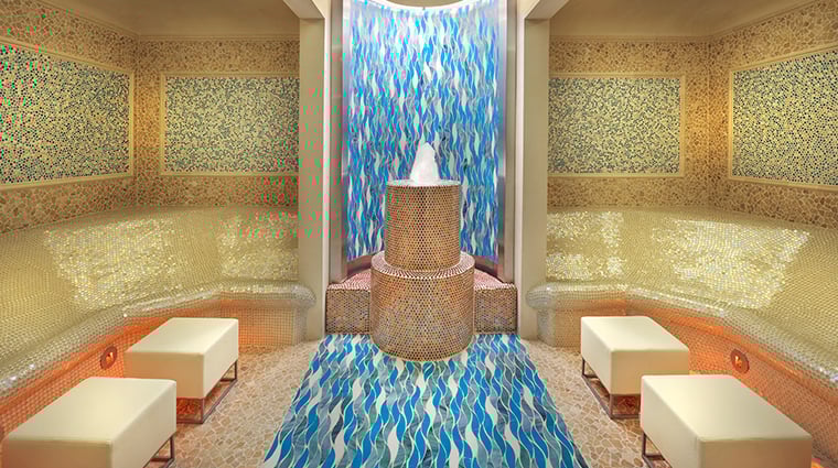 A bead-filled rain stick marks the threshold between Nevada's high desert and this 30,000-square-foot sanctuary clad in over a hundred varieties of marble and stone. The Rasul ceremony—mineral muds applied in an herbal steam chamber—precedes the rare Pantai Luar massage, performed here using heated sachets of coconut, lime, and herbs. Cedar saunas, tea lounges, and indoor-outdoor pools complete the retreat.