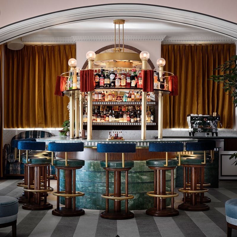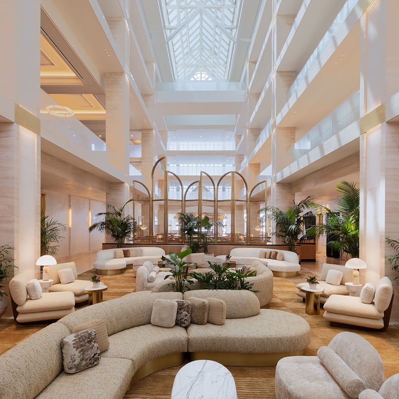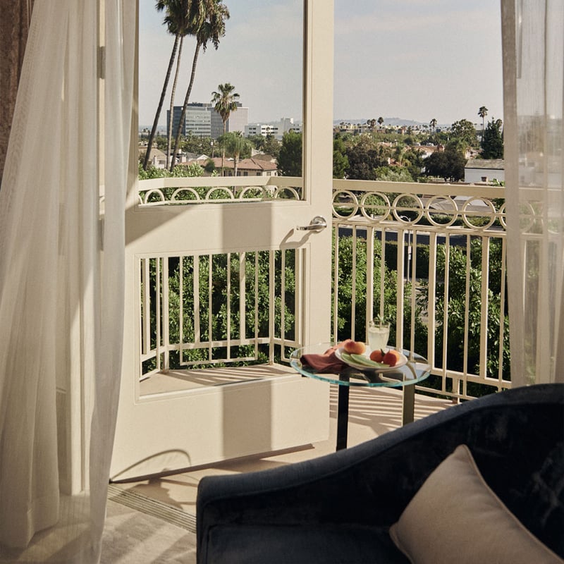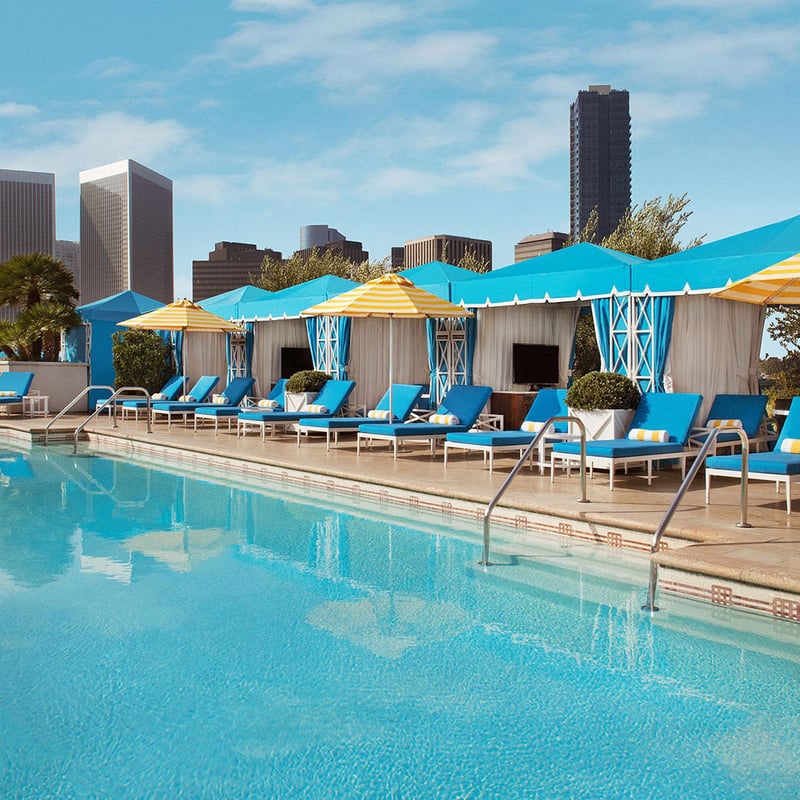 The Maybourne group's California debut channels the elegance of Claridge's through warm Art Deco interiors that honor Hollywood's golden era. Its ninth-floor rooftop delivers sweeping views to the Hollywood sign, while the blue-mosaic pool plays music underwater. The intimate Whisky Bar pours rare Macallan scotch alongside refined spa treatments and Uma Ayurveda rituals—classically indulgent, quintessentially Beverly Hills.