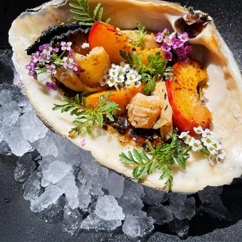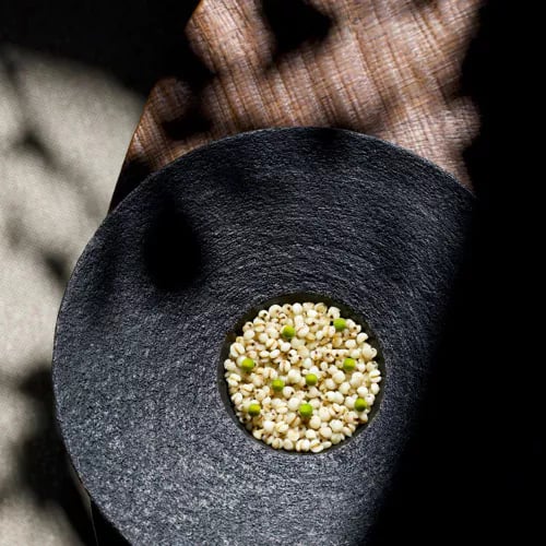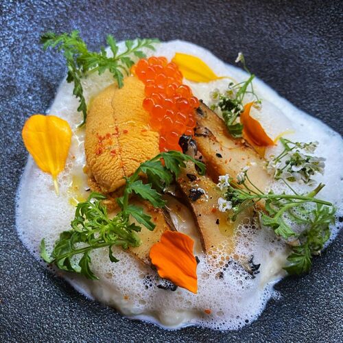 Chef Josef Centeno's Michelin-starred kitchen presents a pescatarian prix-fixe rooted in Japanese and Italian traditions, served at an intimate counter overlooking the open flames. The satsuki porridge—a silky moat of parmesan cream crowned with Santa Barbara uni—anchors a menu built on peak-season ingredients: flash-seared tuna with pluots and dill aioli, squid ink spaghetti threaded with Maine lobster and fava greens, snapper over sweet corn polenta.