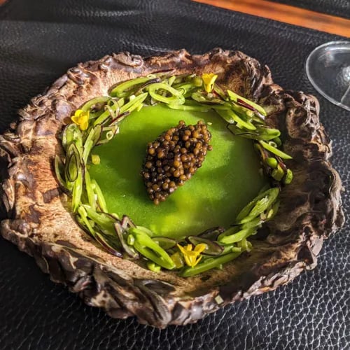 Behind a 1929 European-style façade in Carmel-by-the-Sea, chef Justin Cogley holds two Michelin stars for cuisine that balances classical precision with contemporary artistry. The eight-course tasting menu arrives as illustrated vellum drawings—ingredients only, no descriptions—while signature preparations like the caviar-topped 'cabbage' taco and Dungeness crab rice roulade demonstrate an intimate connection to California's coastal terroir. Handmade serving vessels complete the tableau.