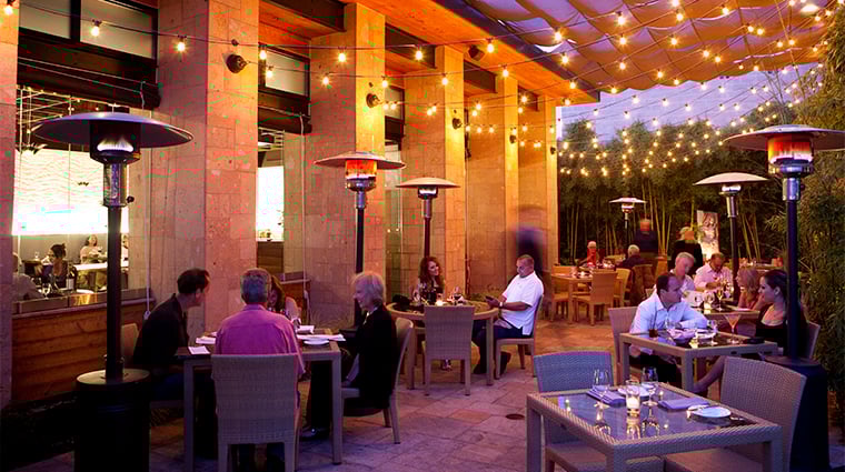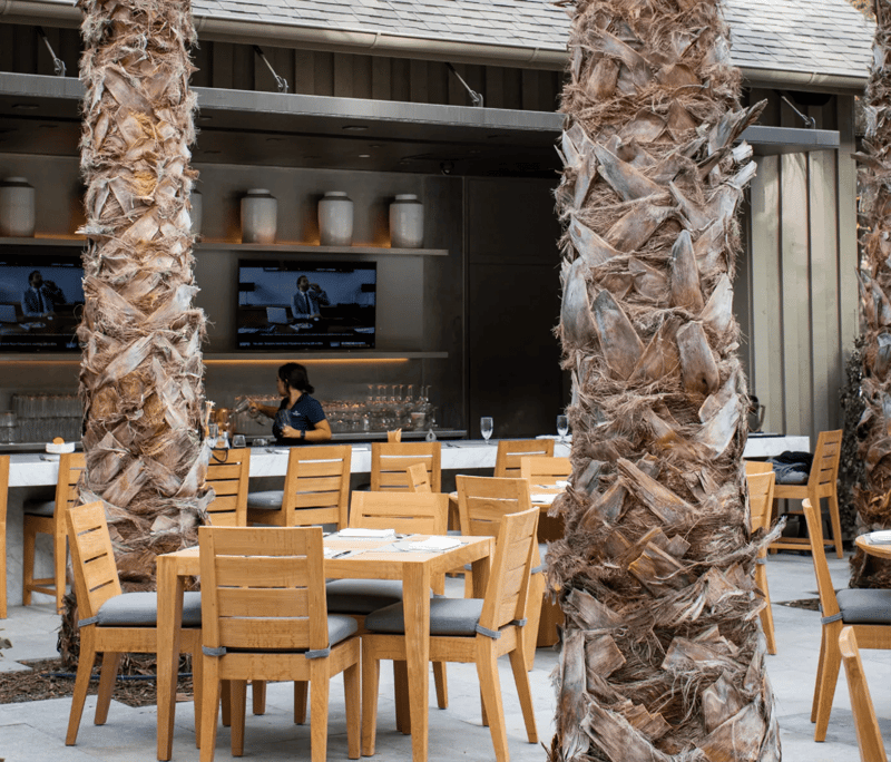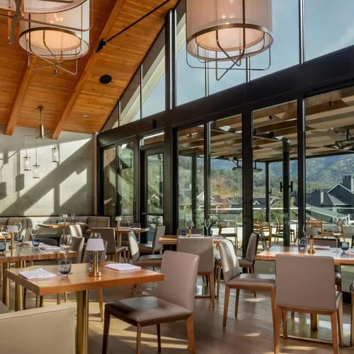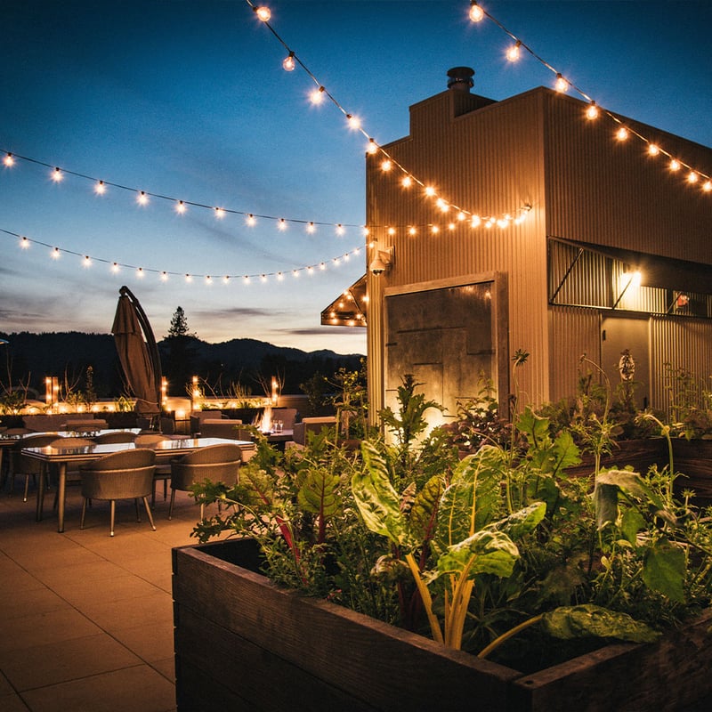 Wicker chairs and Edison bulbs cast a warm glow across FARM's patio, creating one of Napa Valley's most romantic dining settings. The kitchen draws directly from on-site gardens where chefs harvest herbs moments before service, while fruit trees heavy with quince, figs, and pomegranates frame the landscaped grounds. Sunday brunch draws crowds for its creative spreads; evenings suit couples seeking farm-driven fine dining beneath cathedral ceilings.