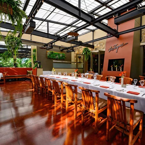 Behind the playful oversized chef's hat marking its entrance, La Toque delivers serious fine dining under Chef Ken Frank's direction. The gleaming open kitchen provides theater as courses arrive—roasted rack of lamb paired with Red Hawk aligot potatoes, dry-aged Liberty Duck breast glazed with za'atar cherry coulis. Leather seating, a working fireplace, and an encyclopedic wine list create the ideal setting for milestone celebrations.