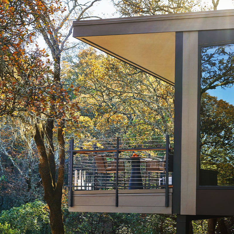Low-slung bungalows in warm earth tones scatter across 258 acres of Sonoma vineyards and heritage oak groves, their floor-to-ceiling glass framing views of Mount St. Helena and the Mayacamas range. The property cultivates its own 15.5-acre vineyard under winemaker Jesse Katz, while Hazel Hill serves French-inflected California cuisine on a sweeping terrace. Rooms feature outdoor firepits and indoor-outdoor showers; the 11,500-square-foot spa includes yoga sessions among the vines.