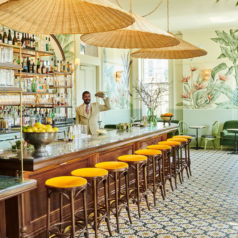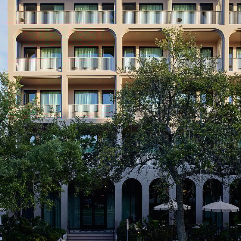A striking contemporary structure on Saint Charles Avenue, Hotel Henrietta weaves classic New Orleans gestures—arched colonnades, traditional galleries—into a decidedly modern silhouette. Inside, the reception's marble walls meet an unexpected parquet ceiling, while forty rooms layer mid-century lines with Art Deco flourishes, furnished with Tivoli radios and Le Labo amenities. The Avenue Room Coffee pivots from morning bagels to evening cocktails, and local art fills every corridor.