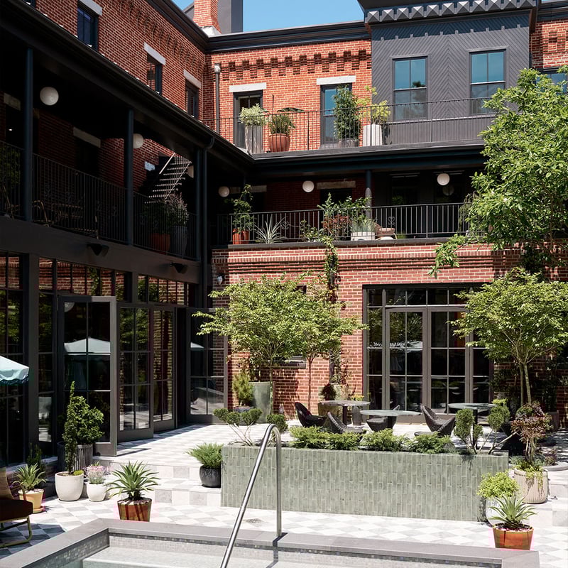 A former women's home and retirement community, this substantial red brick building in Fishtown now houses 50 rooms where modern furnishings meet antique pieces in warm, minimalist compositions. The interior courtyard centers on a heated pool, while Bastia serves Mediterranean cooking on-site. A sauna and pet-friendly policy round out the amenities, making it a proper boutique anchor for the neighborhood.