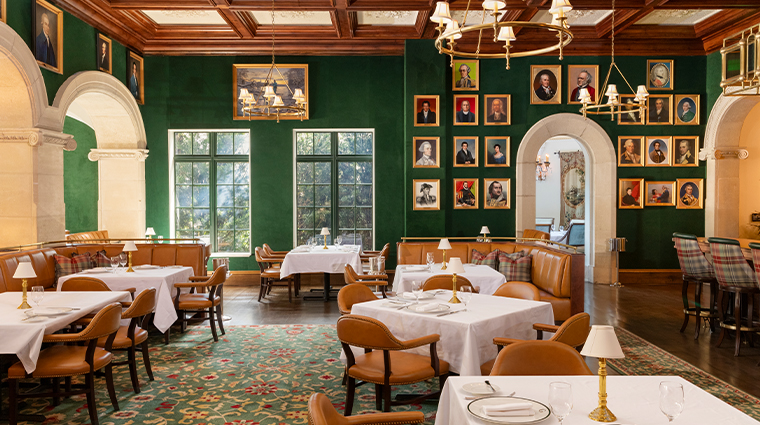Crystal chandeliers cast light across bas-relief walls and a hand-carved stone fireplace, tables dressed with hand-painted china and silver flatware. Chef Aaron Bellizzi's farm-to-table kitchen delivers refined Southern plates—Atlantic halibut with strawberry and rhubarb, filet de boeuf in Madeira sauce périgueux. The adjacent lounge, all dark mahogany, serves tapas and inventive cocktails for those preferring intimacy over grandeur.