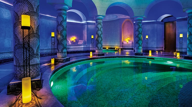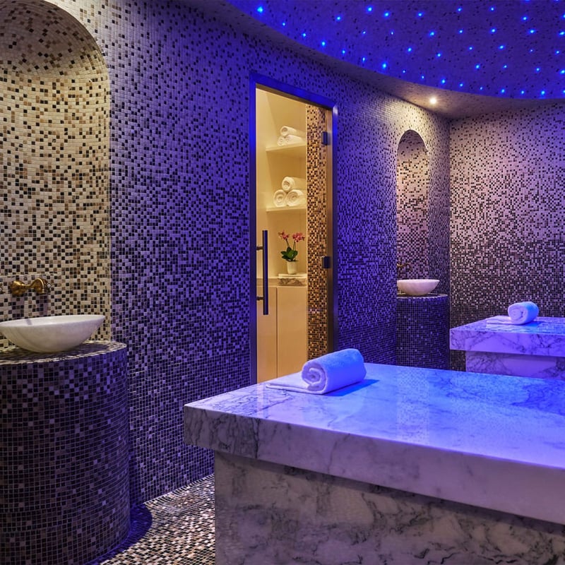 Water defines every aspect of this expansive spa, from its Thalasso pool and quartet of plunge pools to treatments drawing on Dead Sea minerals and Arabian botanicals. The signature On the Banks of the Dead Sea ritual layers mineral-rich mud in a deeply restorative sequence, while the atrium pool—framed by white-washed walls and a Romanesque statue—channels Mediterranean serenity steps from the resort's private beach.