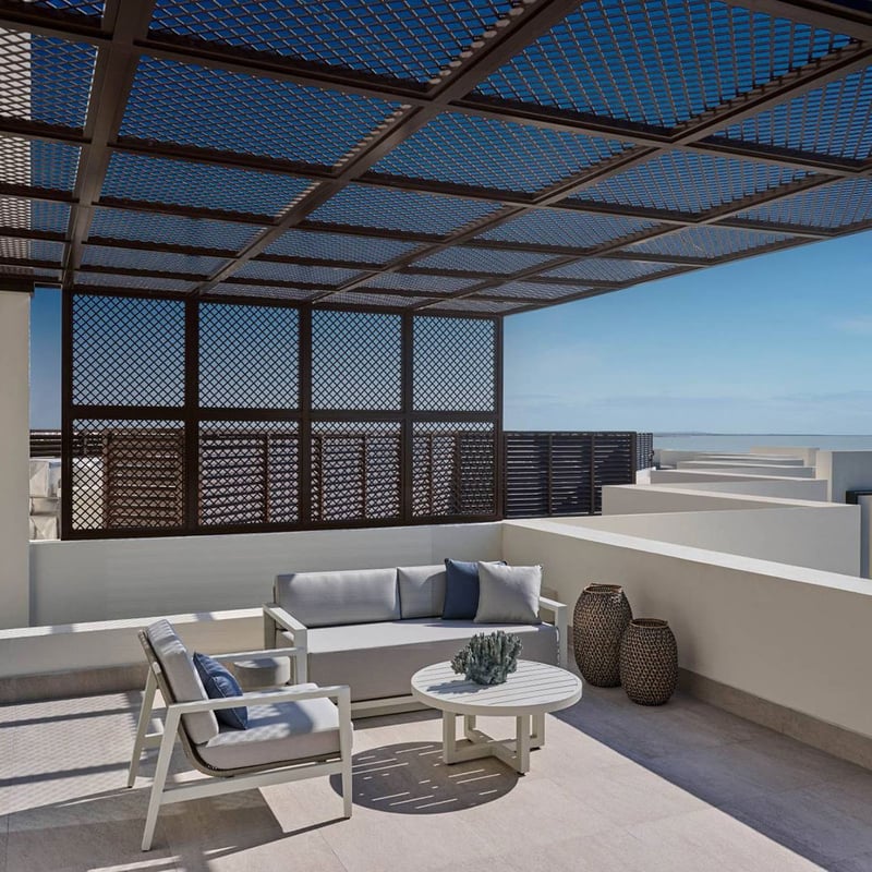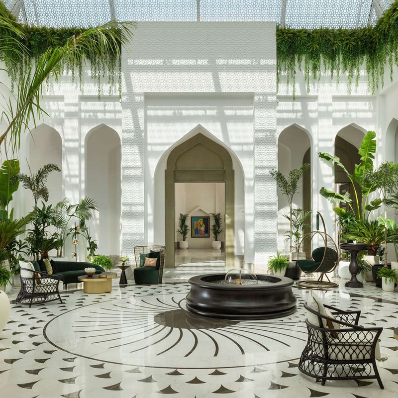 Adjacent to Bab Al Bahrain souq, this 46-suite boutique hotel doubles as a contemporary art gallery, its walls hung with Bahraini, Gulf, and international works. Suites function as proper apartments—kitchenette, living area, bedroom—dressed in saturated colors and bold fabrics. The rooftop pulls together an emerald-tiled pool, restaurant, bar, and garden terrace, while spa facilities round out an unexpectedly complete urban retreat.