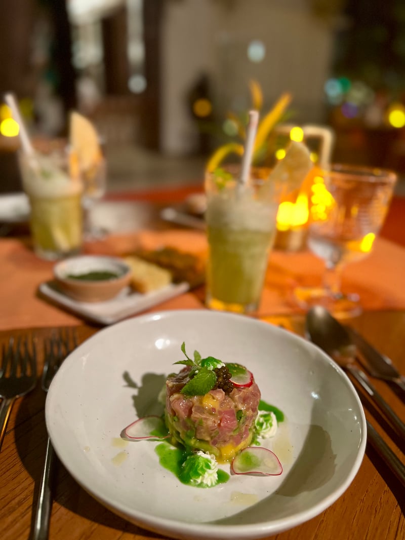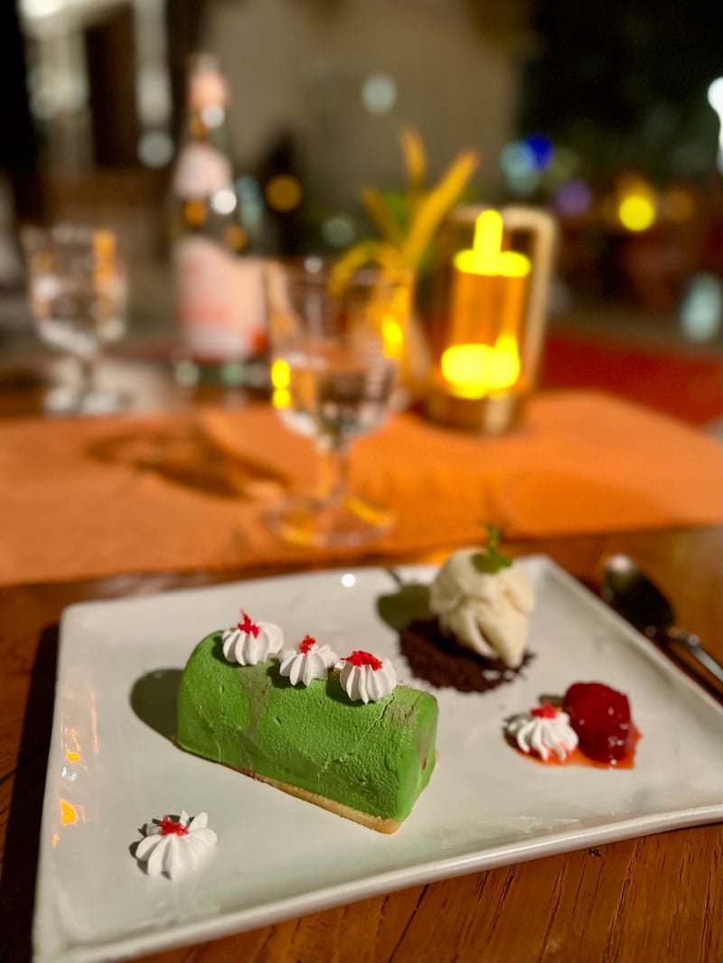 The evening began smoothly with refreshing mocktails aptly named Scribe Frozen Wilds, a fragrant blend of passion fruit, fresh mint leaves, lime juice, and sugar syrup. We then opted for the four-course Khmer Voyage menu, a true invitation to a gustatory journey. As a starter, the A4 Saku tuna ceviche, accompanied by avocado, cucumber broth, caviar vinaigrette, and zucchini and mint oil, set the stage with finesse. Then came the Tom Yam soup with freshwater shrimp, perfectly spiced with galangal, lemongrass, mushrooms, and coconut milk. For the main course, the grilled organic duck breast, served with sautéed eggplants, Kampot pepper, kaffir lime leaf, and Thai roots, offered a powerful yet refined blend of flavors. Finally, to conclude the culinary journey in style, the Matcha Strawberry dessert combined the sweetness of strawberry compote with the intensity of high-quality matcha and the lightness of mascarpone. An exquisite dinner enhanced by a hypnotic performance: a rare and unforgettable moment.