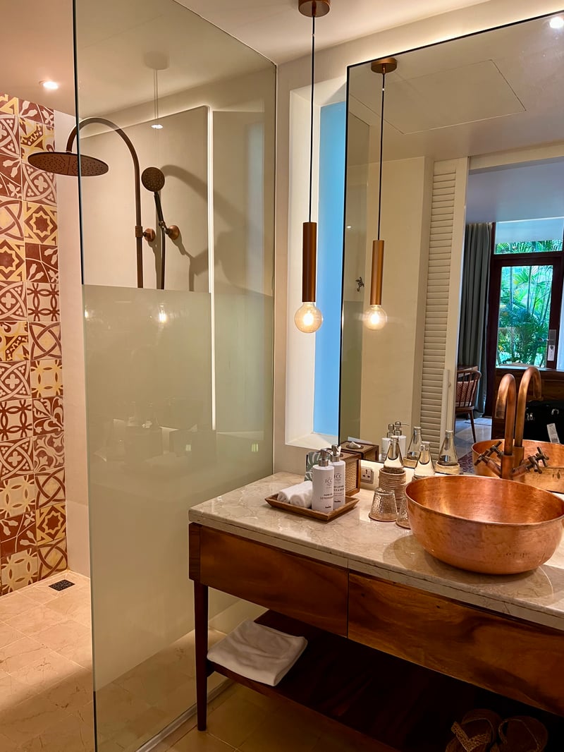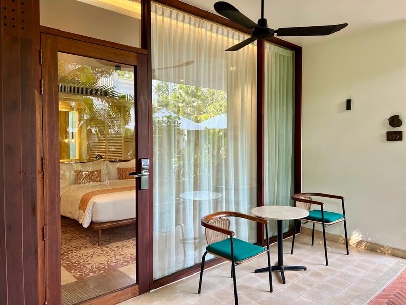 We stayed in a 33 sqm Deluxe Courtyard Room, featuring a private balcony with pool views, perfect for enjoying the tranquility at the end of the day. The decor combines contemporary elegance and subtle Khmer details, with natural wood elements, artisanal objects, and a beautiful harmony of neutral tones. The bathroom, equipped with a copper basin and a rain shower, impresses with its neat aesthetics and quality finishes. Everything is designed to offer modern comfort in a setting with typical Cambodian charm.