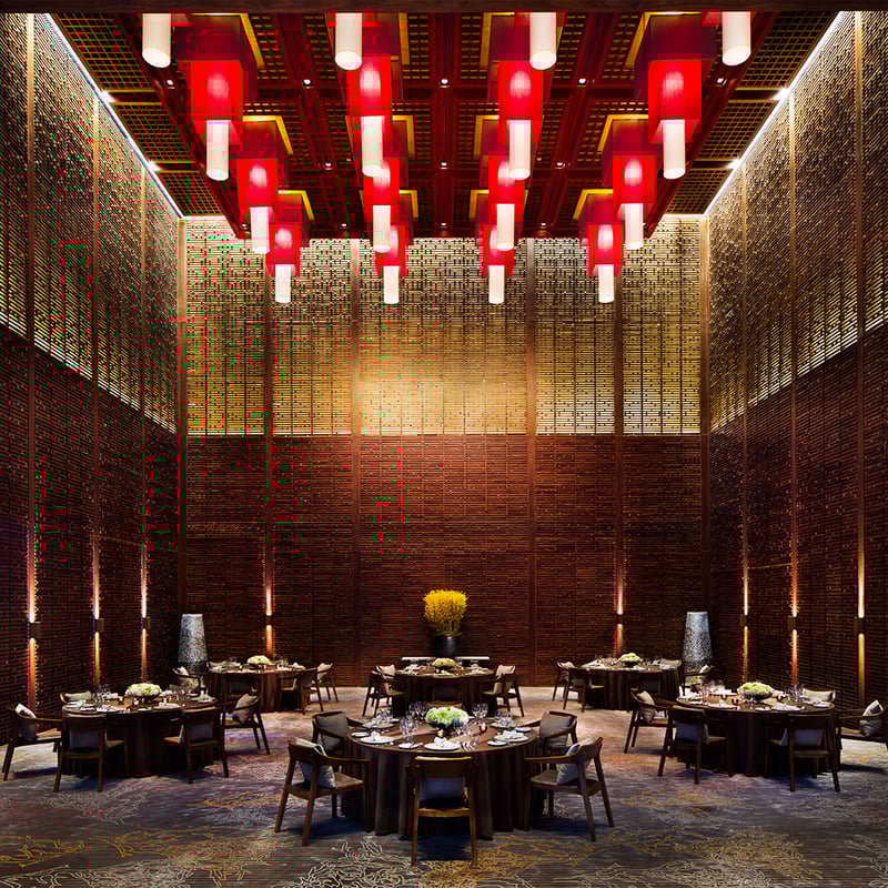 Jean-Michel Gathy's design channels Shanghainese mansion grandeur through a four-story foyer of deep red brick and wooden latticework framing the South China Sea. A five-mile crescent beach with coral reefs anchors the resort, while five pools—including the 400-foot Sunny Bay Pool—and a spa complex of freestanding villas with open-air courtyards cater to families and couples seeking seclusion on Hainan's southern coast.