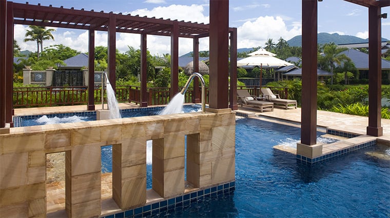 Seven private treatment rooms with en suite facilities ensure an unhurried experience at this intimate golf resort spa, where therapies target sun-exposed skin and sport-fatigued muscles using natural ingredients. The hydrotherapy circuit—hot and cold plunge pools, steam room, jetted vitality pool—prepares guests for treatments, while bamboo accents and cascading water features echo Hainan's tropical landscape. An infinity pool with submerged loungers overlooks dense canopy beyond.