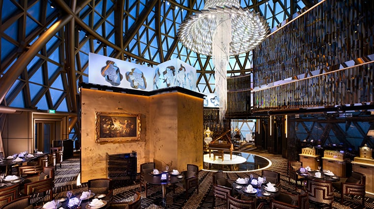 A private elevator ascends to the 43rd floor, where a Steinway pianist plays beneath a chandelier of 131,500 Swarovski crystals and floor-to-ceiling windows frame Macau's glittering skyline. The kitchen delivers creative French compositions—le caviar with cauliflower cream, soft-boiled egg with aged Comté mousse—while sommeliers navigate a 16,800-bottle cellar toward rare European vintages. Generous table spacing ensures an intimate, unhurried evening.