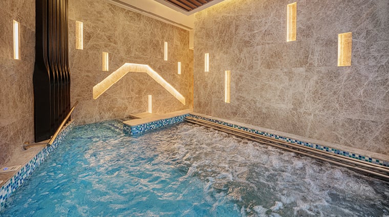 Portuguese mosaic details and Chinese wooden accents set the tone in a lobby where marble meets warm neutrals. The women's water zone suspends cocoon-shaped chairs above a shimmering vitality pool, while birdcage-inspired leather loungers fill the relaxation room with tea and quiet. Signature treatments open with a ceremonial foot bath and hot tea, leading into dimly lit rooms wrapped in dark wood and onyx.
