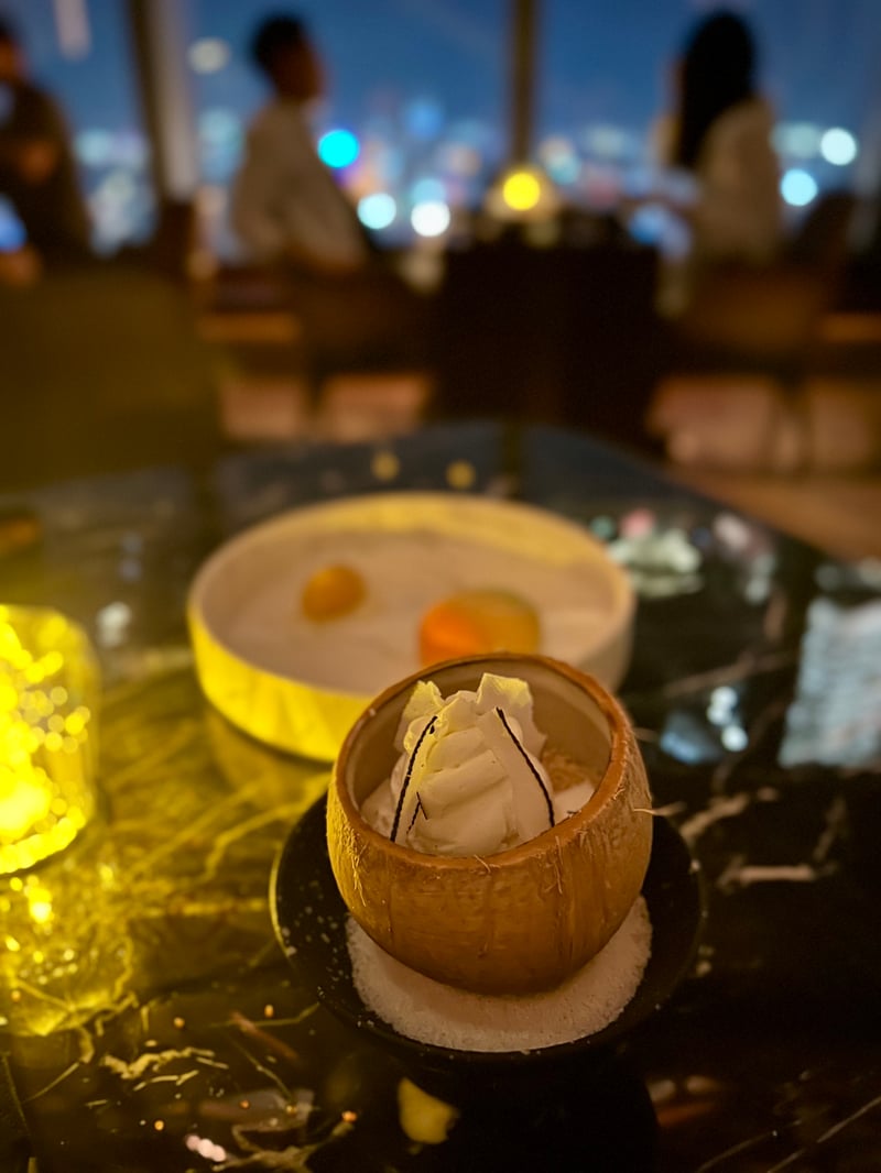 Finally, the tasting ended on an elegant sweet note. The Mango, a tropical cake paired with intensely flavored sorbet, offered an ideal contrast between smoothness and freshness, highlighted by a minimalist presentation that showcased the fruit's vivid color. To conclude this culinary journey, the signature dessert “Coconut, coconut, coconut…”—served in a coconut shell—offered a playful variation on the theme: ice cream, jelly, crispy chips, and crumble intertwined in a harmonious play of textures. Fresh, indulgent, and creative, the desserts perfectly embodied the inventive spirit of Flair Rooftop Restaurant & Bar.