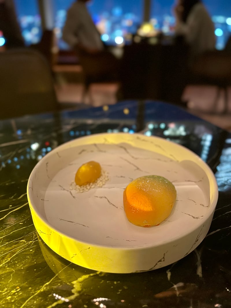 We began our dinner with two cocktails, each with distinct personalities. Color of Fall subtly blends Cointreau with Chinese rice wine Huang Jiu, enhanced by osmanthus, verjuice, and plum powder. Its golden hue evokes Shanghai's autumn—yellowing parasol tree leaves, delicate floral scents, and culinary traditions. On the palate, the balance of fruity sweetness, light acidity, and floral notes creates an elegant and nostalgic experience. My husband chose the bolder The Tip of the Nose, featuring a 12-year-old Singleton Scotch single malt enriched with unexpected hints of peanut butter, cocoa, and cherry. This surprising mix, rich and enveloping, evokes a fleeting, almost intimate memory—a sensation that lingers delicately.