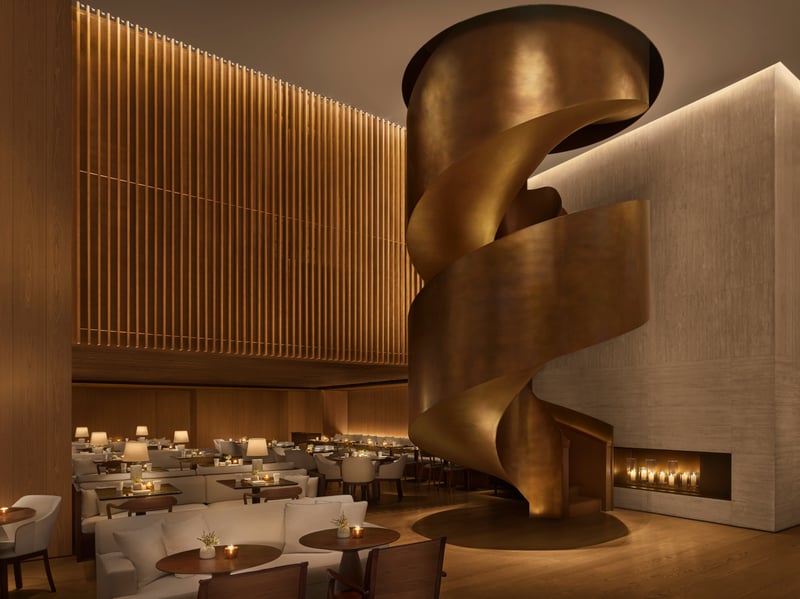 Perched on the 58th floor of the luxury hotel, Flair Rooftop Restaurant & Bar stands out with a refined design that subtly marries modernity and a sense of heritage. Designed by Japanese firm STRICKLAND, the space draws inspiration from Shanghai's cosmopolitan spirit and cultural legacy. The interior, with its elegant geometric lines, combines wood, stone, and diamond-shaped metal lattices, creating an atmosphere that is both contemporary and warm. Every detail evokes the city's identity, harmoniously connecting its historic Art Deco charm with the modern energy of Lujiazui.