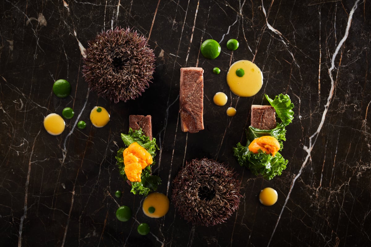 Then comes the meat: an Australian M9 Wagyu of remarkable tenderness, coated with a ponzu jus carrying slightly acidic umami accents. A touch of sea urchin adds silky marine creaminess as a counterpoint. Beside it, finely worked cauliflower couscous brings lightness, brightened by citrus freshness. A grilled beef heart skewer provides a deeper, more robust second reading. The plate plays with contrasts — land and sea, richness and clarity, softness and intensity — without ever losing harmony.