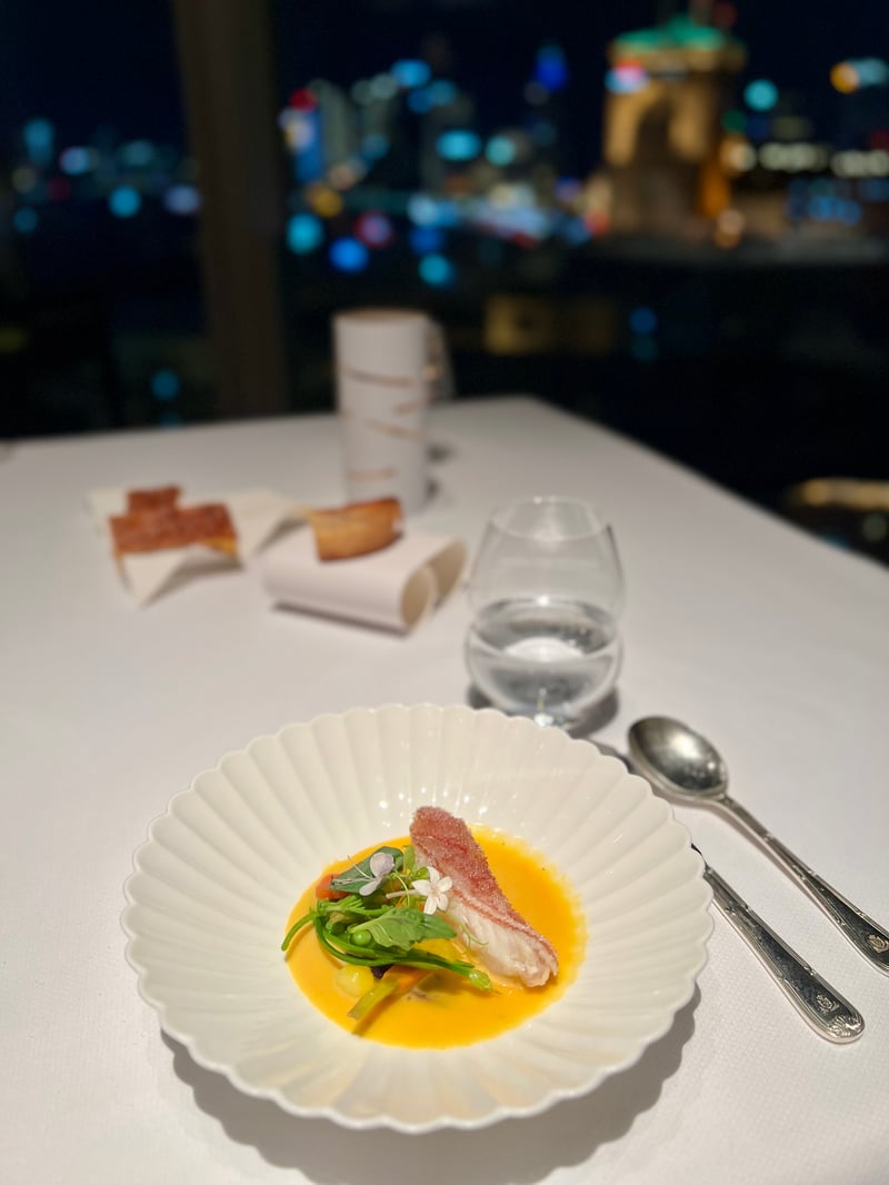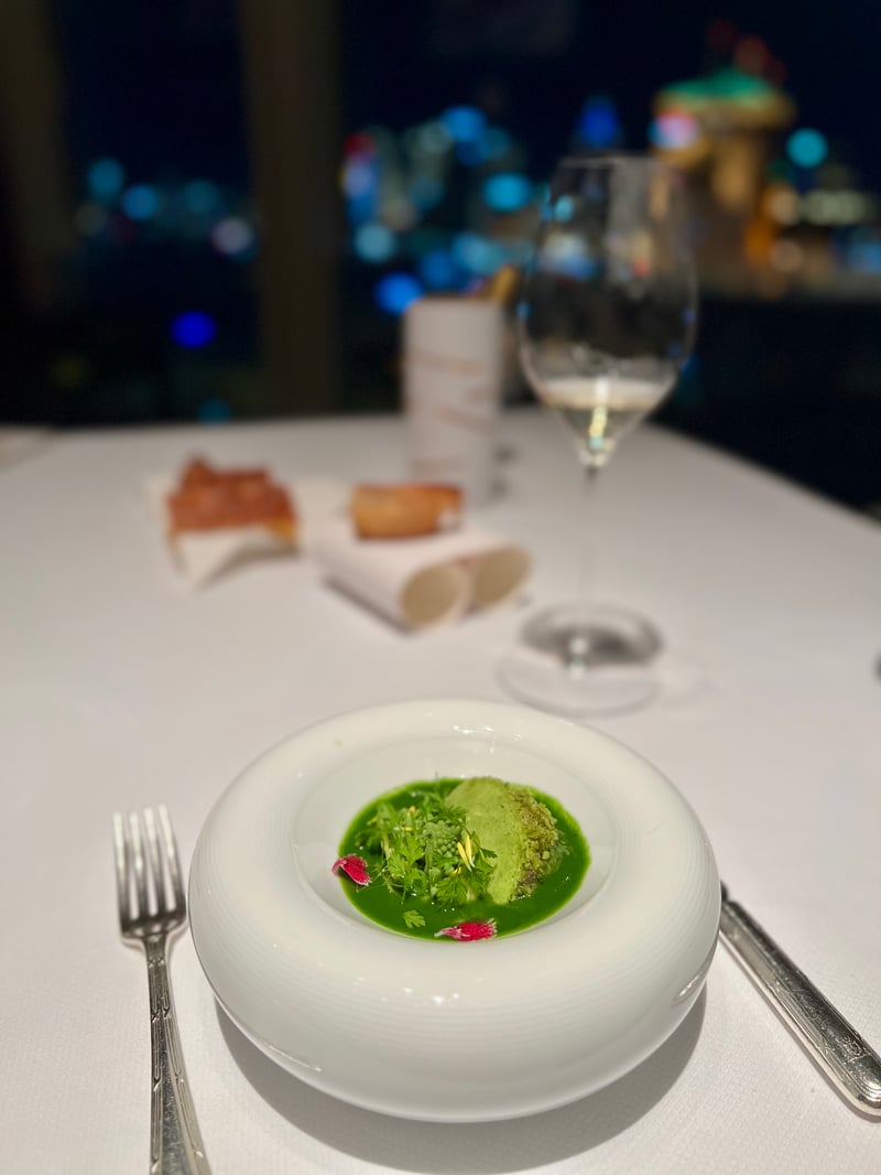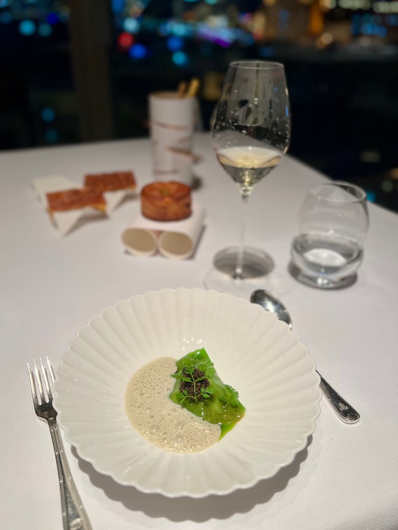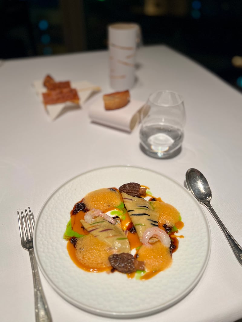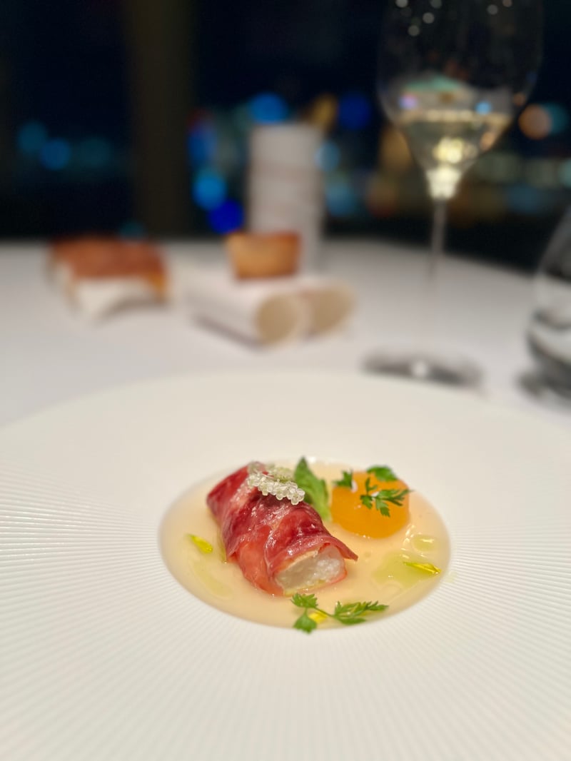 Facing the shimmering lights of the Bund, on a pristine table, arrive four delicate amuse-bouches, conceived as fragments of a journey that reveal the chef's path: a crisp, refined bite inspired by Shanghai; another, smoky and iodized, evoking the shores of Iceland; a delicately aromatic vegetable composition transporting us to Bangkok; and finally, a creamy and comforting bite infused with the soul of Piedmont. Each is savored in one precise, polished mouthful, like a culinary jewel. To accompany these first steps, a glass of The Peninsula Deutz, Blanc de Blancs 2010, Aÿ is served. Its fine bubbles, floral and mineral notes, and elegant structure highlight the delicacy of these tastings.
